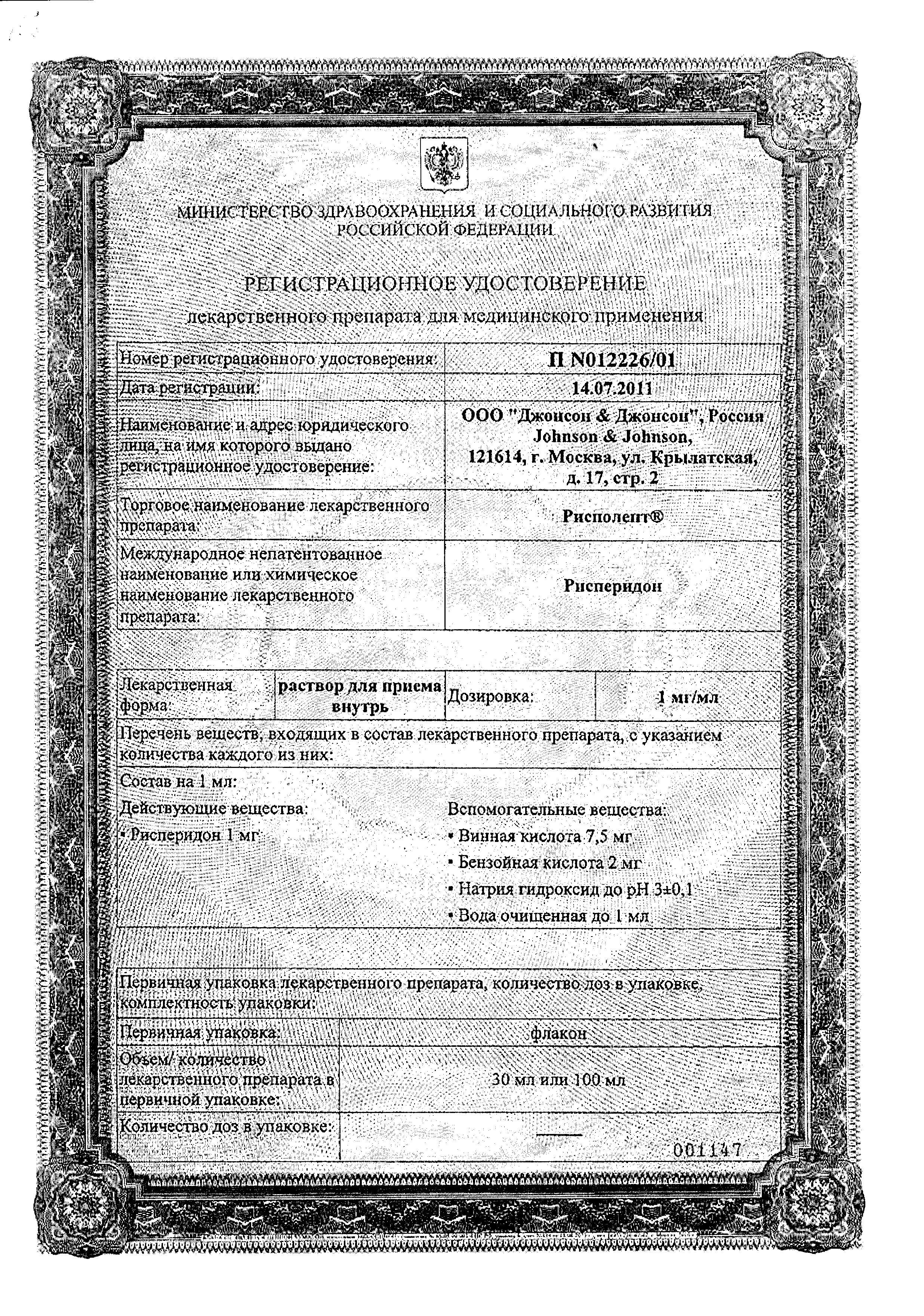 Применение. Доза препарата зависит от вида заболевания и его тяжести. Обычная доза составляет от 0,5 до 16 мг в сутки, Рисполепт принимают независимо от приема пищи.