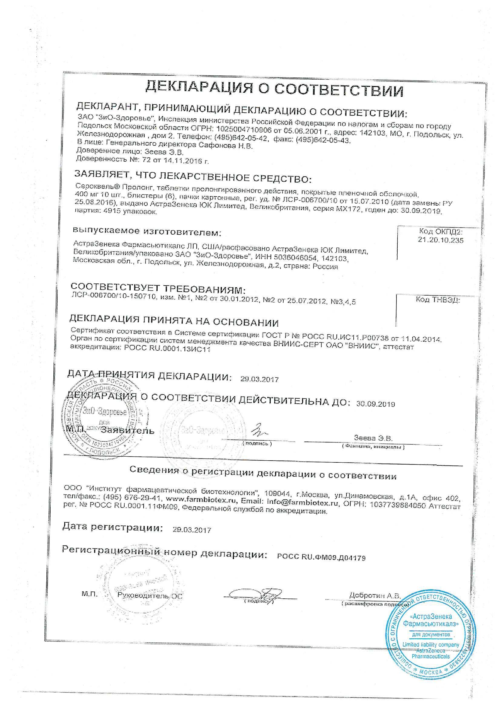 1 таблетка Сероквель Пролонг содержит: кветиапина фумарат 57,56 мг; 172,69 мг; 230,26 мг; 345,38 мг и 460,5 мг (эквивалентно 50, 150, 200, 300 и 400 мг кветиапина соответственно).