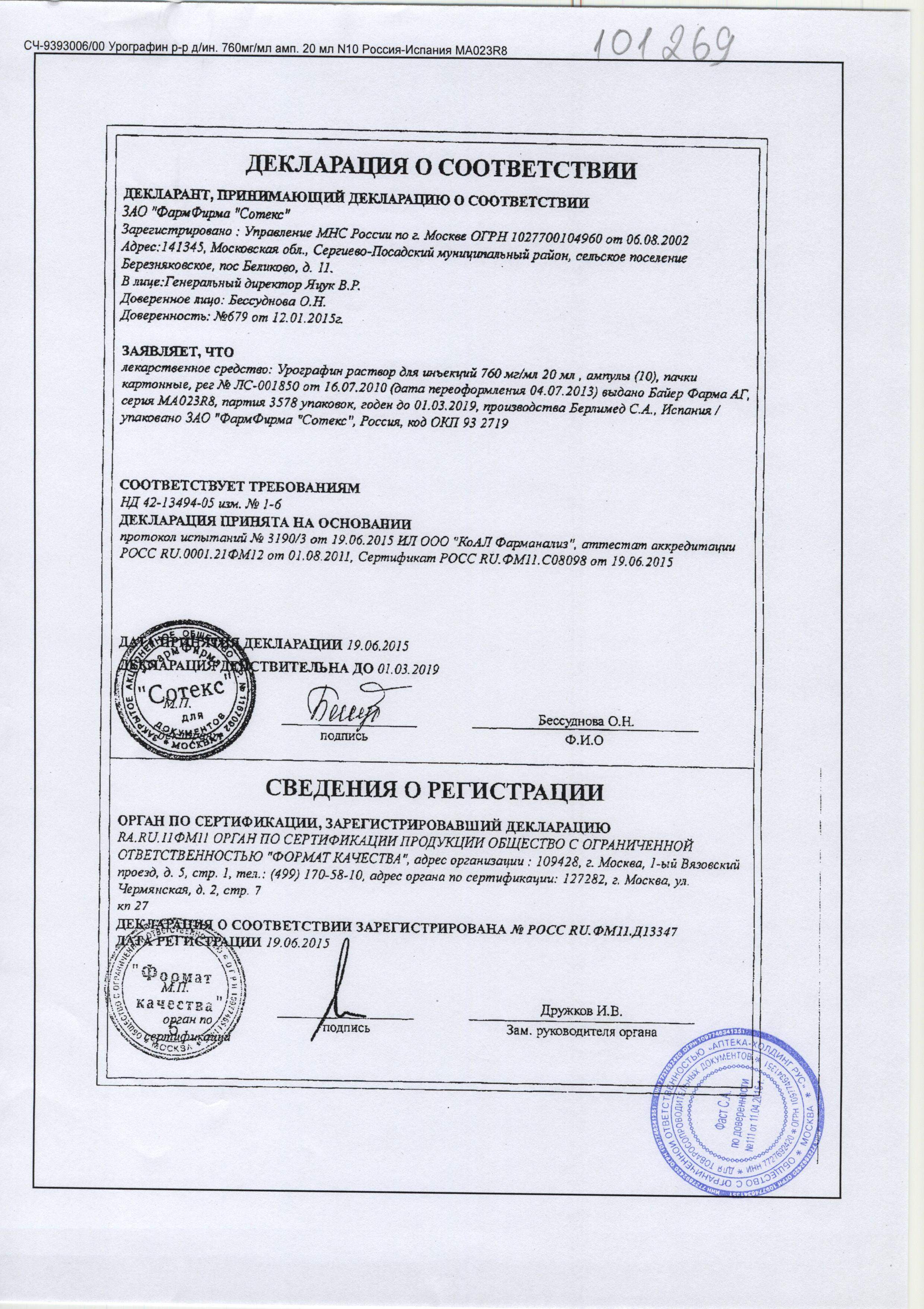 Показания. Рекомендовано купить Урографин для проведения холангиопанкреатографии, внутрисосудистой урографии, фистулографии, саливографии, артрографического обследования, внутривенной урографии, а также магнитно-резонансной холангиографии. Диагностический препарат Urografin используется также при подозрении мочекаменной болезни, гематурии, воспалении лоханки почки, инфекции мочевыводящих путей, обструкции мочеточника.