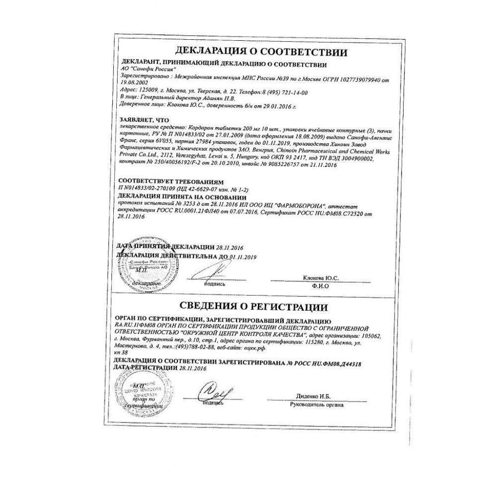 Применение. Кордарон в таблетках принимается перед едой. Точная дозировка определяется лечащем врачом индивидуально. В среднем, разовая терапевтическая доза составляет 200 мг, а суточная терапевтическая доза составляет 400 мг. Максимально допустимая дозировка препарата Cordarone в сутки составляет 1200 мг.